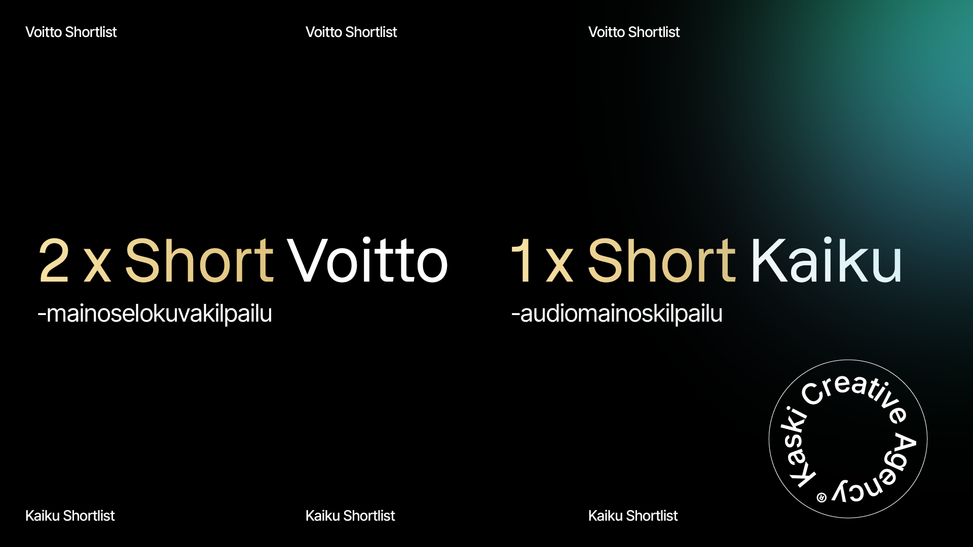 Kasken työt ovat päässeet shortlistille eli finaaliin kaikissa mainosalan kotimaisissa kilpailuissa alkuvuonna – Voitto, Kaiku, Vuoden Huiput ja Grand One.