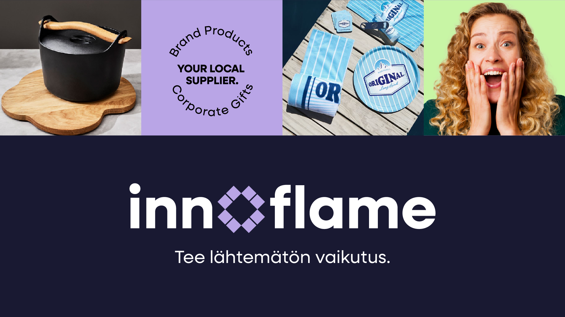 Tee lähtemätön vaikutus. Se on asiakkailleen brändituotteita, HR-lahjoja ja työvaatteita tarjoavan Innoflamen lupaus. Muotoilimme Innoflamelle itselleen brändi-ilmeen ja markkinointikonseptin, jotka tekevät lähtemättömän vaikutuksen.